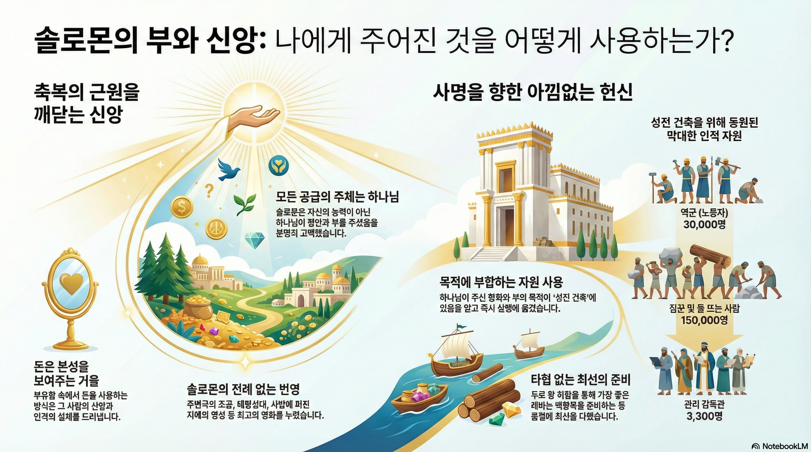 사람들이 이런 말을 합니다. 돈은 그 사람의 본성을 가장 잘 보여준다. 갑자기 큰돈이 생기면 그 사람이 어떤 사람인지 극대화되어 나타나게 됩니다. 선한 사람이 큰돈이 생기면 그 돈으로 다른 사람을 돕고 선한 일을 합니다. 악한 사람이 큰돈이 생기면 그 돈은 악한 일에 사용됩니다. 이것을 신앙에도 적용해볼 수 있는 것 같습니다. 어떻게 돈을 사용하는가를 보면 그 사람의 신앙을 조금은 알 수 있습니다. 앞선 4장에 보면 솔로몬이 얼마나 부와 영화를 누렸는지가 잘 나옵니다. 주변의 나라들이 조공을 바쳐 경제적으로 아주 풍요를 누렸습니다. 궁에서 하는 쓰는 음식물의 양도 엄청났습니다. 뿐만 아닙니다. 4장 25절과 26절에 보면 백성들도 평안히 살고 병거와 말도 많았습니다. 솔로몬은 자신은 지혜롭다는 소문이 사방 모든 나라에 들렸습니다. 사람들이 솔로몬의 지혜를 들으려고 찾아왔습니다. 요즈음 식으로 말하면 아주 힙한 인플루언서였습니다. 이렇게 부유하고 사람들에게 인정받은 솔로몬에 대한 이야기가 끝나고 바로 5장이 시작됩니다. 솔로몬은 무엇을 하나요? “5 여호와께서 내 아버지 다윗에게 하신 말씀에 내가 너를 이어 네 자리에 오르게 할 네 아들 그가 내 이름을 위하여 성전을 건축하리라 하신 대로 내가 내 하나님 여호와의 이름을 위하여 성전을 건축하려 하오니” 성전을 건축하겠다고 합니다. 본래 성전은 다윗이 건축하고자 했습니다. 하지만 하나님은 다윗이 건축하지 못하고 다윗의 다음 왕이 건축할 것이라고 하셨습니다. 솔로몬은 이 말씀에 따라 여호와의 이름을 위하여 성전을 건축하겠다고 합니다. 자신이 누리고 있는 부와 영화에 취하지 않고 하나님을 먼저 생각하고 있습니다. 솔로몬이 이럴 수 있었던 이유는 무엇인가요? “4 이제 내 하나님 여호와께서 내게 사방의 태평을 주시매 원수도 없고 재앙도 없도다” 솔로몬은 알았습니다. 자신이 지금 누리고 있는 부와 태평이 어디서부터 왔는가를 알았습니다. 자신이 잘나서가 아닙니다. 자신의 능력이 아닙니다. 하나님이 주셨다고 고백하고 있습니다. 하나님이 주신 목적도 분명하게 알고 있습니다. 성전을 건축하게 하기 위해서입니다. 그러기에 솔로몬은 하나님의 뜻대로 성전을 건축하려고 합니다. 성전 건축이 해야만 하는 일이기 때문에 대충하지 않습니다. 두로 왕 히람에게 사람을 보냅니다. 가장 좋은 레바논의 백향목을 준비합니다. 뿐만 아닙니다. 자신이 할 수 있는 많은 사람을 동원하고 있습니다. 13절에 보면 역군의 수가 삼만 명입니다. 15절에 보면 짐꾼이 칠만 명이고, 산에서 돌을 뜨는 사람이 팔만 명입니다. 16절에 보면 그 일을 감독하는 관리가 삼천삼백 명이었습니다. 아버지의 유언이기 때문에 어쩔 수 없이 성전을 건축하는 것이 아니라 최선을 다하여 성전을 건축하고 있습니다. 솔로몬의 이야기가 꼭 돈에 대한 이야기만은 아닙니다. 무엇이 되었든 나에게 주어진 것들을 어떻게 사용하느냐는 신앙의 척도가 될 수 있습니다. 모든 것을 공급해주시는 분이 하나님이라는 사실을 알고 하나님의 뜻대로 사용하는 성도들이 되시기를 소망합니다.