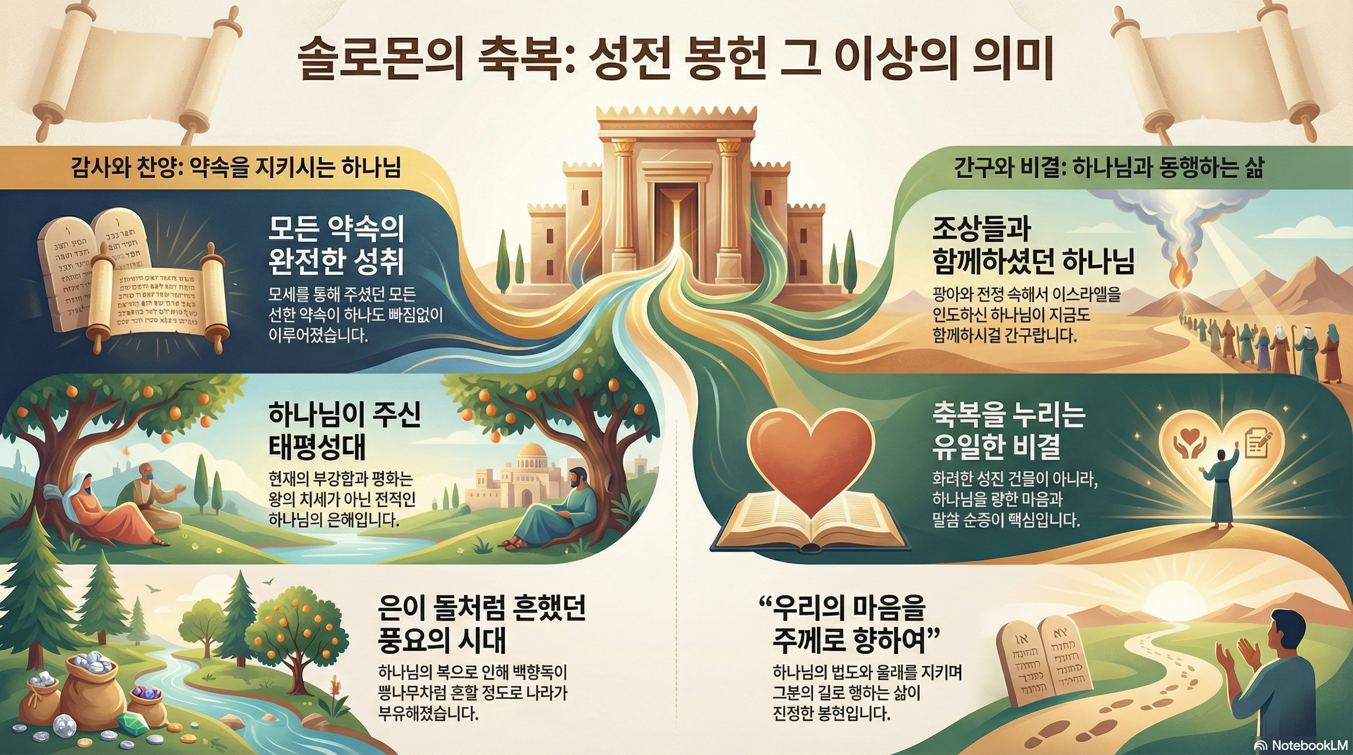 열왕기는 제목 그대로 이스라엘 왕들에 대한 이야기입니다. 그런데 이 왕들의 이야기 중에서 아주 비중 있게 다루고 있는 것이 성전건축에 대한 이야기입니다. 열왕기상 6장에서 8장까지 3장에 걸쳐 성전 건축과 봉헌에 대한 말씀이 있습니다. 성전이 이스라엘 백성들에게 얼마나 중요한 의미가 있는지 잘 알 수 있습니다. 열왕기상 8장에는 성전 건축을 끝낸 솔로몬의 기도와 백성들을 향한 축복이 기록되어 있습니다. 오늘은 성전 봉헌의 마지막인 솔로몬의 축복을 살펴보려고 합니다. 솔로몬은 먼저 하나님을 찬양합니다. “56 여호와를 찬송할지로다 그가 말씀하신 대로 그의 백성 이스라엘에게 태평을 주셨으니 그 종 모세를 통하여 무릇 말씀하신 그 모든 좋은 약속이 하나도 이루어지지 아니함이 없도다” 하나님을 찬양하는 이유가 무엇인가요? 하나님께서 이스라엘 백성들에게 태평을 주셨기 때문입니다. 하나님께서 모세를 통하여 주셨던 그 좋은 약속들을 다 이루셨다고 고백하고 있습니다. 현재 솔로몬 시대는 정말로 평안한 시대입니다. 처음 이스라엘 왕국이 세워질 때는 참 불안정했습니다. 다른 나라의 침입도 많았습니다. 사울에서 다윗으로 넘어가는 시기에는 왕권을 둘러싼 내분도 많았습니다. 같은 민족끼리 전쟁을 하며 죽이는 일이 벌어졌습니다. 지금은 다릅니다. 다윗 시대를 지나면서 나라의 위상이 높아졌습니다. 다른 나라에서 함부로 덤빌 수 없는 나라가 되었습니다. 다윗에서 솔로몬으로 왕권이 이양될 때 있었던 내분도 다 해결이 되었습니다. 나라도 부유합니다. 10장에 보면 얼마나 부유했는지 은이 돌같이 흔했습니다. 솔로몬은 이러한 부와 평안을 바로 하나님께서 주셨다고 고백하고 있습니다. 자기가 왕으로서 나라를 잘 다스려서가 아닙니다. 오직 하나님이 약속대로 이 나라에 태평을 주셨다고 말하고 있습니다. 이 사실을 잘 알기에 솔로몬은 계속 간구합니다. “57 우리 하나님 여호와께서 우리 조상들과 함께 계시던 것 같이 우리와 함께 계시옵고 우리를 떠나지 마시오며 버리지 마시옵고” 솔로몬은 하나님이 함께 하시기를 구하고 있습니다. 그러면서 앞에 단서를 하나 붙입니다. ‘우리 조상들과 함께 계시던 것 같이’ 하나님은 이스라엘 백성들과 함께 하셨습니다. 애굽에서 430년 동안 종살이 하던 이스라엘 백성들을 구원하셨습니다. 광야 40년 동안 낮에는 구름기둥으로 밤에는 불기둥으로 인도하셨습니다. 아침마다 만나로 먹이시고, 때에 따라 메추라기와 생수를 공급하셨습니다. 광야에서 이스라엘 백성들을 위협하는 무리들을 물리치셨습니다. 하나님이 함께 하실 때 요단강은 갈라졌고, 여리고성은 무너졌습니다. 지금 솔로몬은 조상들과 함께 하셨던 것과 같이 이제 자신들에게도 함께 해달라고 간구하고 있습니다. 그렇다면 어떻게 해야 하나님이 함께 하십니까? 어떻게 해야 하나님이 함께 하시는 축복을 누릴 수 있습니까? 지금 솔로몬은 아름다운 성전을 건축했습니다. 이렇게 하나님께 화려하고 멋진 성전을 지어 바치면 하나님이 함께 하십니까? 화려한 성전을 지어 바쳐서가 아닙니다. 하늘의 하나님은 인간이 지은 성전에 계실 수 없는 무한하신 분이십니다. 이 하나님이 함께 할 수 있는 유일한 방법은, 하나님과 동행하는 삶을 살 수 있는 유일한 방법은 하나입니다. “58 우리의 마음을 주께로 향하여 그의 모든 길로 행하게 하시오며 우리 조상들에게 명령하신 계명과 법도와 율례를 지키게 하시기를 원하오며” 우리의 마음을 하나님께 바쳐야 합니다. 하나님의 말씀을 지키며 살아야 합니다. 이렇게 사는 사람들에게 하나님은 함께 하시고 복을 내려주십니다. 지금 솔로몬은 화려하게 지어진 성전 앞에서 성전을 자랑하는 것이 아니라 하나님의 뜻대로 살자고 독려하고 있습니다. 오늘날 우리가 하나님의 축복을 받는 비결도 같습니다. 우리의 마음이 하나님을 향해야 합니다. 하나님의 뜻대로 살아야 합니다.