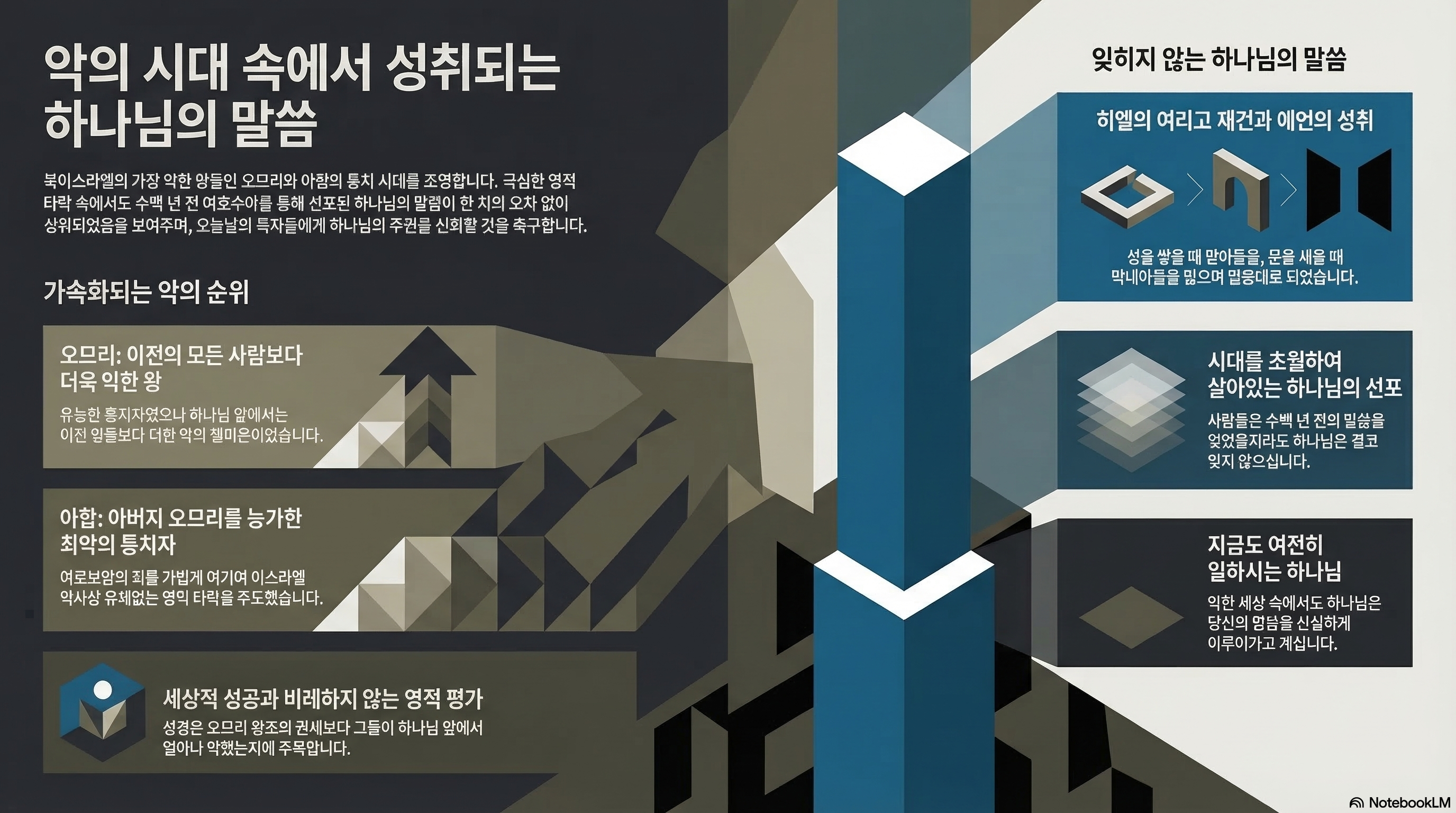 우리나라 사람들은 세계 최고, 1등이라는 말을 참 좋아합니다. 1등을 싫어하는 사람들이 얼마나 있겠습니까? 이것이 좋은 일에 1등이면 좋은데 반대면 문제입니다. 세계에서 가장 행복지수가 높은 나라 1등, 세계에서 자원봉사가 가장 활달한 나라 1등 같으면 좋습니다. 그런데 뉴스를 통해 우리나라가 교통사고율, 음주운주, 이혼율 같은 것에서 1등을 한다는 소식을 듣습니다. 이런 것 1등은 정말 부끄러운 일입니다. 오늘 본문은 정말 부끄러운 1등의 모습이 나타나 있습니다. 누가 누가 더 악한가입니다. 반복되는 표현을 보겠습니다. “25하 그 전의 모든 사람보다 더욱 악하게 행하여” “30하 그의 이전의 모든 사람보다 여호와 보시기에 악을 더욱 행하여” “33하 그 이전의 이스라엘의 모든 왕보다 심히 이스라엘 하나님 여호와를 노하시게 하였더라” 25절에 나오는 왕은 오므리 왕입니다. 30절과 33절의 왕은 오므리의 아들 아합왕입니다. 오므리 왕은 이전의 어떤 사람보다 악한 왕이었습니다. 악의 챔피온이었습니다. 그런데 아들 아합이 왕이 되면서 이 악한 왕 챔피온의 자리를 아합에게 내주게 됩니다. 아들 아합은 아버지 오므리 보다 더 악한 왕이었기 때문입니다. 오늘 본문은 유례를 찾아볼 수 없는 악한 왕들의 이야기가 기록되어 있습니다. 오므리 왕을 시작으로 북이스라엘에 오므리 왕조가 시작됩니다. 이 오므리 왕조는 역사적으로 보면 융성했습니다. 27절에 보면 오므리 왕을 이야기하면서 그가 부린 권세라고 기록되어 있습니다. 오므리는 강력하고 유능한 통치자였습니다. 오므리 왕조는 여러 번 왕조가 바뀐 북이스라엘에서 가장 오랜 기간 유지되었습니다. 하지만 성경은 이러한 사실을 별로 관심이 없습니다. 그 왕들이 세상에서 얼마나 성공했는지가 중요한 것이 아니라 하나님 앞에서 어떠했는지가 중요합니다. 그들은 하나님 앞에서 악한 왕이었습니다. 오므리는 이전의 모든 사람보다 더 악을 행했습니다. 오므리의 아들 아합은 더 악한 왕이었습니다. 31절 상반절에 보면 아합은 하나님을 떠난 여로보암의 죄를 오히려 가볍게 여겼습니다. 이렇게만 보면 오늘은 본문은 정말 암울합니다. 온통 하나님을 대적하는 모습만 나타나 있습니다. 더 이상 하나님이 아무런 힘을 쓰지 못하는 상황처럼 보입니다. “34 그 시대에 벧엘 사람 히엘이 여리고를 건축하였는데 그가 그 터를 쌓을 때에 맏아들 아비람을 잃었고 그 성문을 세울 때에 막내 아들 스굽을 잃었으니 여호와께서 눈의 아들 여호수아를 통하여 하신 말씀과 같이 되었더라” 34절을 보면 좀 이상합니다. 앞뒤의 맥락과 전혀 상관이 없는 일을 기록하는 것처럼 보이기 때문입니다. 34절 앞에는 아합이 얼마나 악한 왕인지 기록하고 있습니다. 그러다 갑자기 히엘이 여리고를 건축하다가 아들들을 잃은 이야기기 기록되어 있습니다. 여리고성을 건축하다가 두 아들을 잃은 히엘의 이야기는 어떤 의미가 있습니까? 하나님의 말씀의 성취입니다. 여호수아 6장에 보면 이스라엘 백성들이 여리고성을 점령하는 사건이 나옵니다. 이 점령이 다 끝나고 하나님은 앞으로 누구든지 이 여리고성을 건축하는 자는 그 맏아들과 막대 아들을 잃을 것이라고 하셨습니다. 이 말씀이 성취되었습니다. 사람들은 이 하나님의 예언의 말씀을 잊어버렸는지도 모릅니다. 하나님이 없는 것처럼 사는 이 시대의 사람들에게 오래전에 하셨던 하나님의 말씀은 아무런 의미가 없었을 것입니다. 하지만 하나님은 잊지 않으셨습니다. 아무리 오래전에 하셨던 말씀이라도 하나님은 반드시 그 말씀을 성취하십니다. 하나님은 여전히 시대 속에서 역사하고 계십니다. 여전히 하나님의 말씀을 성취하고 계십니다. 다만 사람들이 그 사실을 모르고 있을 뿐입니다. 오늘날의 세상도 참 악합니다. 누가 누가 더 악한지를 뽐내는 것 같은 세상입니다. 이 악한 세상에서 우리가 반드시 기억할 것이 있습니다. 하나님은 지금도 여전히 일하시고 계십니다. 여전히 당신의 말씀을 성취하십니다. 우리가 지금도 살아 역사하시는 하나님을 믿고 의지하면서 살 수 있기를 소망합니다.