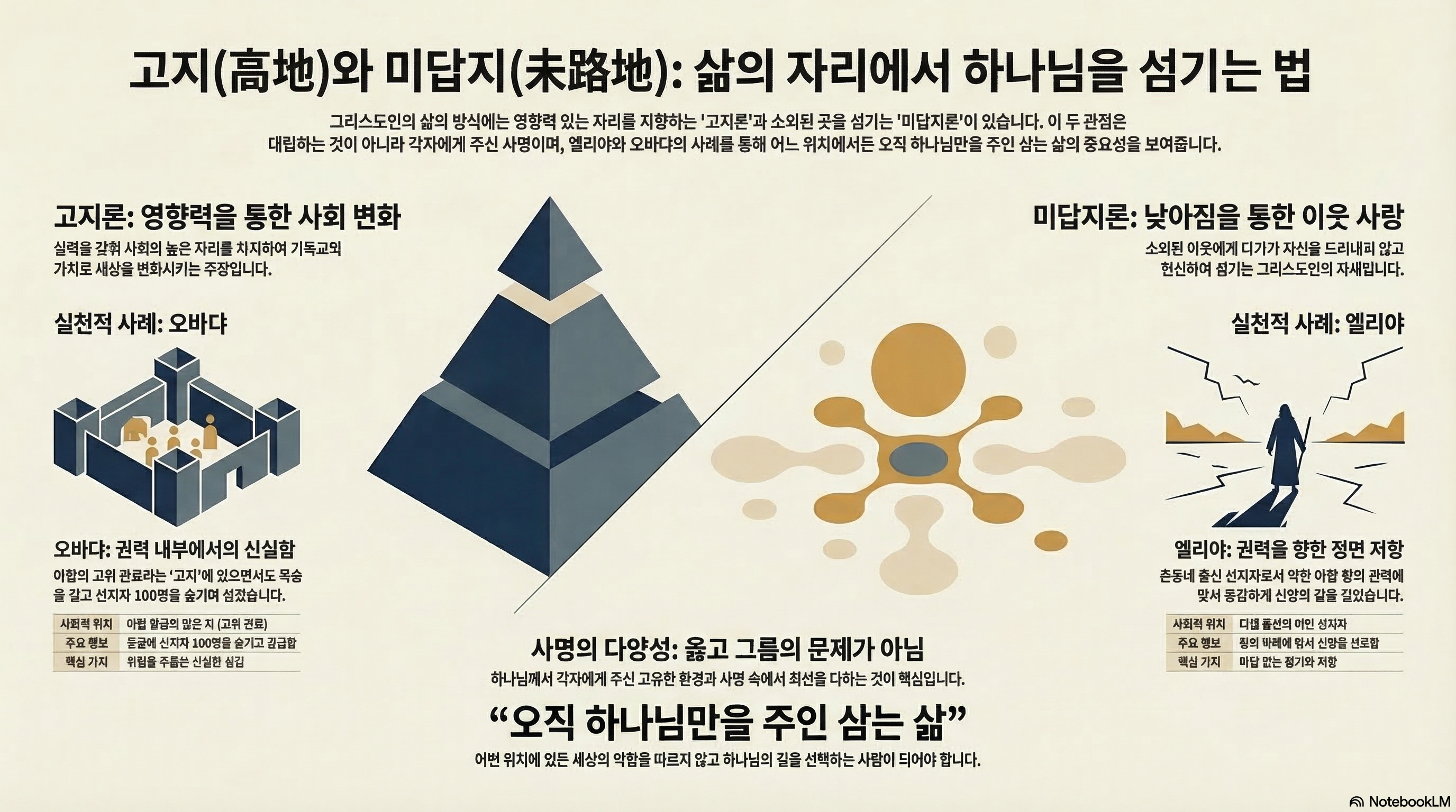 고지론과 미답지론이라는 것이 있습니다. 고지론은 그리스도인들이 철저하게 실력으로 무장해서 사회의 영향력 있는 자리를 차지해야 한다는 주장입니다. 미답지론은 사회에서 소외된 이웃과 아픔을 당한 이웃에게 가서 섬기는 것이 그리스도인의 진정한 자세라고 합니다. 자신을 드러내지 않고 남들이 잘 가려고 하지 않는 것으로 가고, 남들이 잘 하려고 하지 않는 일을 해야 합니다. 어느 것이 맞다 틀리다 말할 수 없습니다. 하나님께서 각자에게 주신 사명 속에서 최선을 다하면 됩니다. 오늘 본문에 나타난 두 사람의 모습을 이 고지론과 미답지론으로 한 번 생각해볼 수 있습니다. 엘리야 선지자와 오바댜입니다. 엘리야 선지자는 디셉이라는 촌동네 출신의 선지자입니다. 하지만 엘리야 선지자는 이러한 권력에 맞서서 저항했습니다. 반면 오바댜는 엘리야와는 다른 길을 걷고 있습니다. 오바냐는 아합의 왕궁 맡은 자입니다. 아합 정권 하에서 고위 관료입니다. 11절에 보면 아합을 ‘주’라고 호칭하고 있습니다. 아합을 섬겨야 하는 위치입니다. 표면적으로만 본다면 악한 정권에 대항하는 엘리야가 대단해보입니다. 자신의 목숨을 걸고 악한 왕에게 저항하고 있습니다. 하지만 그렇게 쉽게 이야기할 수 없습니다. 오바댜는 자신의 위치에서 자신의 신앙을 잘 지키고 있습니다. “3하 이 오바댜는 여호와를 지극히 경외하는 자라” 오바댜를 소개하면서 “여호와를 지극히 경외하는 자”라고 평가하고 있습니다. “12하 당신의 종은 어려서부터 여호와를 경외하는 자라” 오바댜 스스로 자신은 어려서부터 하나님을 경외하는 자였다고 말하고 있습니다. 하나님을 경외하는 오바댜가 아합 밑에서 높은 자리에 있는 것은 결코 쉽지 않았을 것입니다. 아합이 얼마나 악한 왕입니까? 악한 왕의 기준이 되는 여로보암의 죄는 오히려 가볍게 여기는 자였습니다. 이렇게 악한 왕 밑에서 높은 관직에 있습니다. 신앙적으로 갈등이 얼마나 많았겠습니까? 때로 두렵기도 했을 겁니다. 하지만 오바댜는 그냥 숨어 신앙생활만 하지 않았습니다. 적당히 눈치 보면서 관직에 있지 않았습니다. “4 이세벨이 여호와의 선지자들을 멸할 때에 오바댜가 선지자 백 명을 가지고 오십 명씩 굴에 숨기고 떡과 물을 먹였더라” 당시 왕비였던 이세벨은 엄청난 악행을 저지릅니다. 하나님의 대적해서 우상을 숭배하는 것을 넘어 하나님의 선지자들을 다 잡아 죽입니다. 정말 무서운 시대입니다. 말 한마디 잘못하면 자신의 목도 날아갈 수 있는 그런 상황입니다 바로 이 때 오바댜는 하나님의 선지자들을 몰래 빼돌려 동굴에 숨깁니다. 한 두 명이 아닙니다. 백 명이나 되는 선지자들을 몰래 숨기고 그들에게 양식을 제공합니다. 목숨 걸고 한 일입니다. 오바댜라는 이름의 뜻은 “여호와를 섬기다”입니다. 오바댜는 악한 정권 밑에서 일하면서 그 악한 정권을 섬긴 것이 아니라 하나님을 섬겼습니다. 고지론은 세상에서 성공하는 기독교인의 모델이 아닙니다. 신앙을 위해 목숨을 던져야 하는 상황이 있을 수 있습니다. 고지에 있지만 여전히 다른 사람이 하지 않는, 가지 않는 미답지의 길을 걷는 사람입니다. 이런 면에서 우리는 다 미답지의 길을 걷는 사람입니다. 신앙을 위해서 세상 사람들과는 다르게 사는 사람들입니다. 오바댜는 온통 하나님을 대적하는 세상에서 세상 사람들이 쉽게 가는 길을 따르지 않고 하나님의 길을 선택한 사람입니다. 바로 이런 사람을 통해 하나님께서 자신의 일을 하십니다. 어느 위치에 있던 오직 하나님을 주인삼아, 하나님을 온전히 섬기는 사람이 되어야 합니다. 세상의 악함을 따르지 않고 하나님의 길을 따르는 사람이 되시기를 소망합니다.