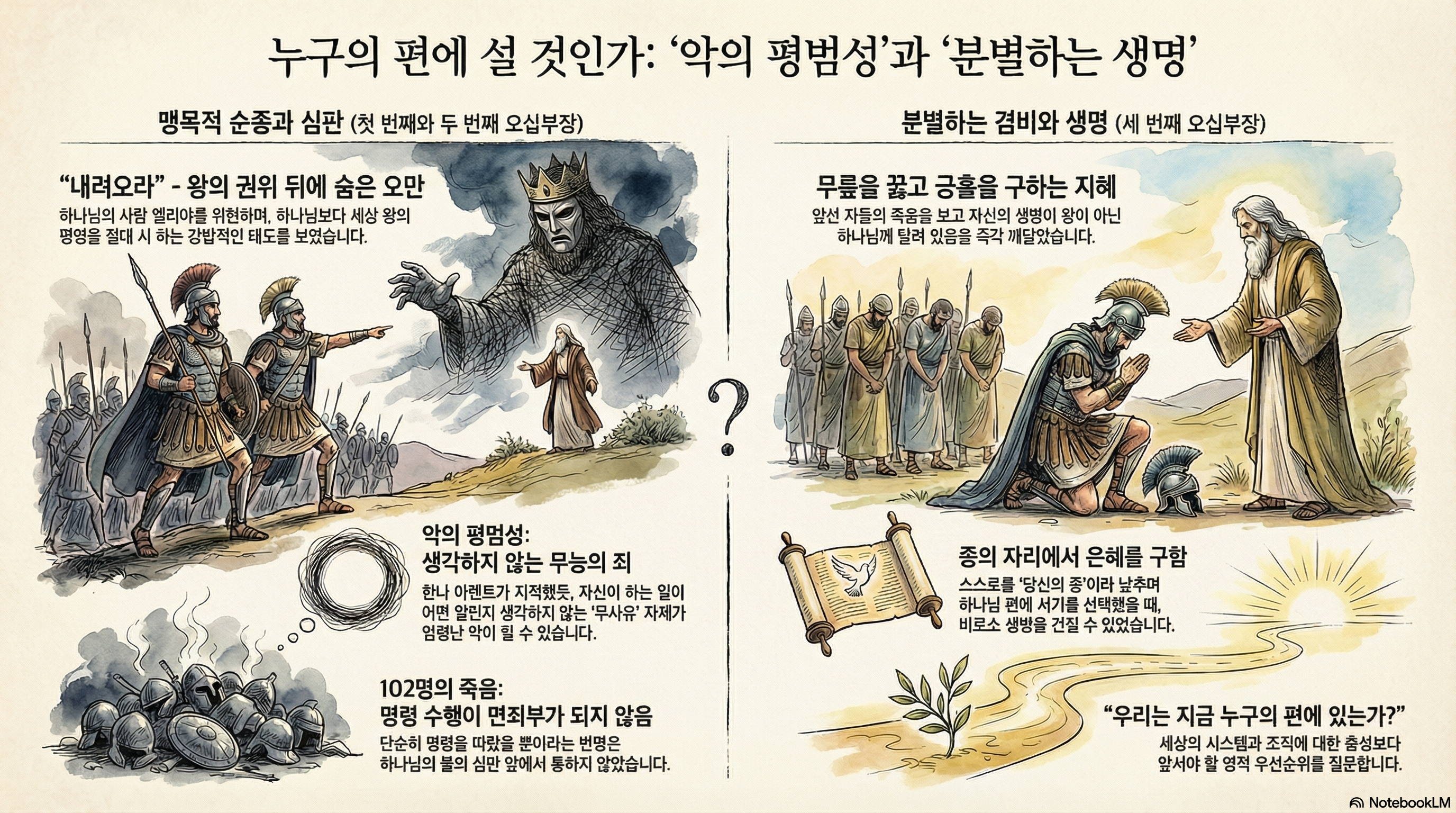 사람이 살다보면 병에 걸릴 수 있습니다. 사고도 날 수 있습니다. 병과 사고가 반드시 하나님의 심판은 아닙니다. 문제는 그 다음입니다. 오늘 본문에 보면 북이스라엘의 아하시야 왕이 다락 난간에서 떨어져 병이 듭니다. 병에 걸린 왕이 어떻게 하나요? 2절에 보면 왕은 에그론의 우상 바알세붑에게 사자를 보내어 병이 낫는지 여부를 묻게 합니다. 이 사자들이 하나님의 사람 엘리야를 만납니다. 엘리야는 우상을 찾은 왕을 책망하며 하나님의 말씀을 전합니다. 아히시야가 결코 낫지 않고 침상에서 죽을 것이라는 말씀입니다. 이 말을 들은 아하시야는 엘리야에게 오십 부장과 그의 군사 오십 명을 보냅니다. 오십 부장과 군사들은 엘리야를 데리러 갔지만 하늘에서 불이 내려와 다 죽고 맙니다. 그래도 왕은 또 다른 오십 부장과 군사를 보냅니다. 이들 역시 하나님의 불의 심판을 받습니다. 세 번째로 왕이 오십 부장과 군사들을 보냅니다. 이 오십 부장은 그 전의 오십 부장과 달랐습니다. 먼저 엘리야에게 은혜를 구합니다. 이 오십 부장은 전의 오십 부장과 달리 죽지 않고 엘리야의 말을 왕에게 전하게 됩니다. 한 번 이 오십 부장에 대해서 생각해보겠습니다. 2명의 오십 부장은 하늘에서 내려온 불로 죽임을 당했고, 1명의 오십 부장은 생명을 건졌습니다. 불로 심판을 받은 오십 부장이나 군사들이 불쌍해 보이기도 합니다. 이들은 다만 왕의 명령을 따랐을 뿐입니다. 명령을 따른 군사에게 죄를 묻는 것이 불합리해 보이기도 합니다. 하지만 정말 명령을 따랐다고 해서 모든 잘못이 용서가 됩니까? 한나 아렌트가 쓴 <예루살렘의 아이히만>이라는 책이 있습니다. 이 재판 과정에서 아이히만은 자신의 무죄를 무장합니다. 명령을 충실하게 이행한 것이 죄가 될 수 없다고 주장합니다. 아이히만은 자신의 말과 같이 특별히 악한 사람이 아니었습니다. 관료 사회에서 쉽게 볼 수 있는 자신이 속한 조직에 그냥 충성하는 그런 사람이었습니다. 여기서 한나 아렌트는 ‘악의 평범성’이라는 단어를 사용합니다. 악마 같거나 아주 잔혹한 성품을 가지고 있어서 수백만 명의 사람을 학살하는 일에 대한 책임을 맡은 것이 아닙니다. 그는 그냥 평범하게 자신이 평소에 행동하던 대로 일을 했을 뿐입니다. 그런데 그 결과는 엄청난 악이었습니다. 이 사람은 그냥 자신이 할 일을 했기에 죄가 없습니까? 한나 아렌트는 무지의 죄를 지적합니다. 자신이 하는 일이 어떤 일인지 알지 못하고, 아니 생각조차 할 수 없는 생각의 무능이 죄라고 이야기 합니다. 또한 내가 한 일 때문에 다른 사람이 어떤 고통을 겪을지 생각조차 하지 못하는, 전혀 공감하지 못하는 것 자체가 잘못이라고 이야기 합니다. 죄에 문제에 있어서 알지 못해서 그랬다는 변명이 통하지 않습니다. 게다가 하나님의 심판을 받은 오십부 장의 행동을 좀 더 세밀하게 볼 필요가 있습니다. 오십 부장이 엘리야에게 이렇게 말합니다. “9하 그가 엘리야에게 이르되 하나님의 사람이여 왕의 말씀이 내려오라 하셨나이다” 우리 말 성경은 굉장히 공손하게 말하는 것처럼 되어 있습니다. 하지만 원어를 보면 오십 부장은 말은 강압적입니다. 우리 식으로 와면 ‘내려 와’하면서 위협적으로 말하고 있습니다. 오십 부장은 자신이 왕의 말을 듣고 있기에 선지자도 무시하면서 이야기하고 있습니다. 지금 이 오십 부장에게는 하나님보다는 왕이 먼저입니다. 왕이 위에 있습니다. 이러한 생각을 가지고 행동한 오십 부장은 결국 하나님의 심판을 받았습니다. 생명을 구한 오십 부장은 달랐습니다. “13 왕이 세 번째 오십부장과 그의 군사 오십 명을 보낸지라 셋째 오십부장이 올라가서 엘리야 앞에 이르러 그의 무릎을 꿇어 엎드려 간구하여 이르되 하나님의 사람이여 원하건대 나의 생명과 당신의 종인 이 오십 명의 생명을 당신은 귀히 보소서” 자신의 생명이 왕의 손에 달려있는 것이 아니라 하나님께 달려있는 것을 알았습니다. 그러기에 먼저 엘리야의 은혜를 구하고 있습니다. 왕의 편에 섰던 오십 부장은 죽고 말았습니다. 하나님의 편에 섰던 오십 부장은 살았습니다. 우리는 지금 누구의 편에 있나요?