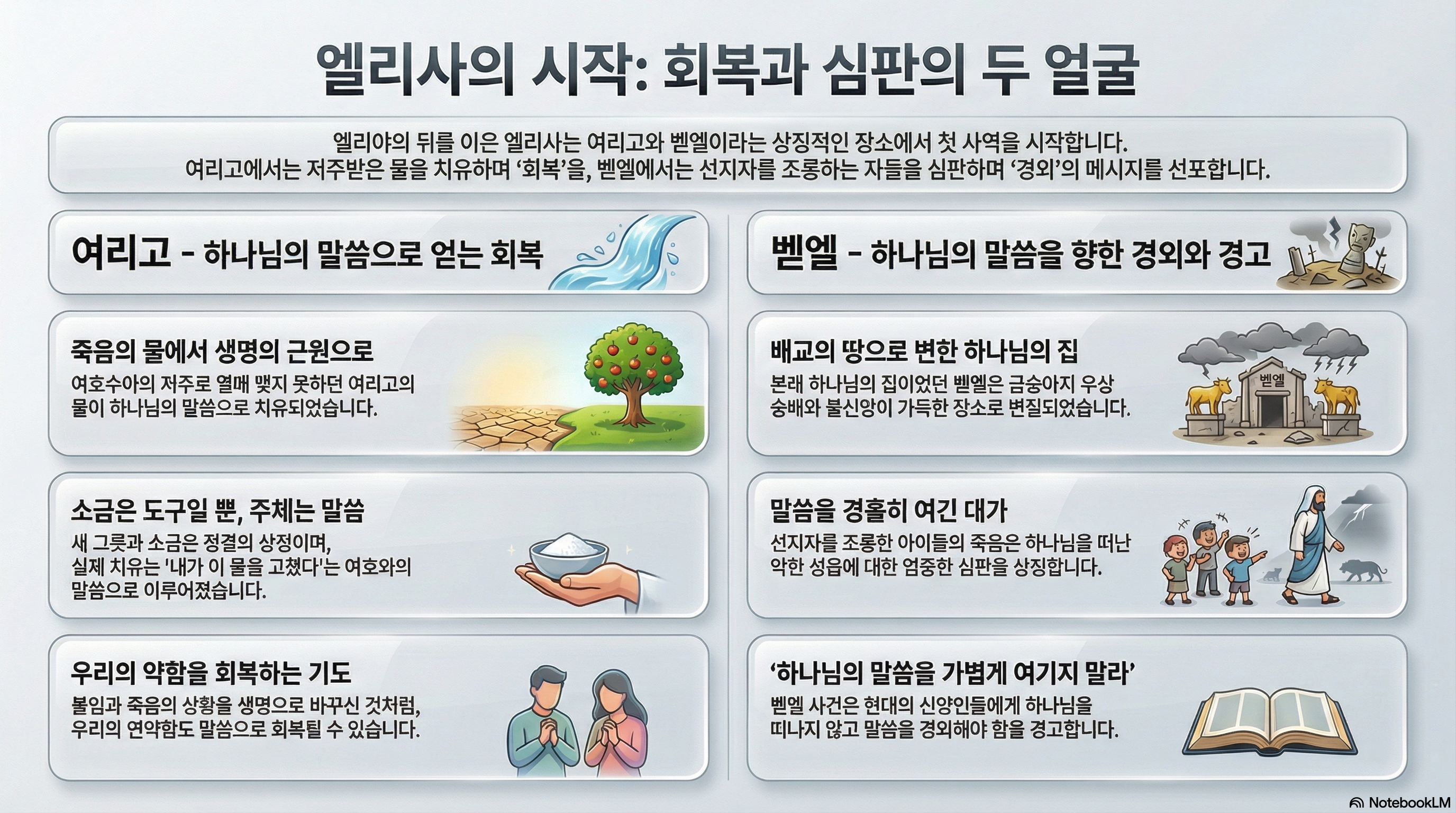 모세와 엘리야는 구약 성경에서 최고의 카리스마를 가진 사람들입니다. 예수님이 변화산에서 만난 구약의 두 인물이 바로 모세와 엘리야였습니다. 모세는 구약 율법을 대표하고 엘리야는 구약의 선지자를 대표합니다. 이 두 사람은 자신의 리더십을 다른 후계자에게 잘 넘겨주었습니다. 모세의 후계자는 여호수아였고, 엘리야의 후계자는 엘리사입니다. 엘리야의 리더십이 엘리사에게 넘어갔습니다. 엘리야는 위대한 선지자였습니다. 이런 선지자의 리더십을 이어받는 것은 굉장히 부담되는 일이었을 것입니다. 엘리야가 승천한 후 엘리사는 선지자로서 홀로서기를 시작합니다. 19절에서 22절의 말씀에 보면 엘리사의 첫 번째 기적이 나오고 있습니다. 엘리사의 첫 번째 기적은 여리고성의 나쁜 물을 고쳐주는 것입니다. 이것은 단순히 물을 바꾸었다는 차원을 넘어섭니다. 장소가 여리고라는 사실을 주목해야 합니다. 처음 모세와 엘리야의 이야기를 했습니다. 이 모세와 엘리야의 뒤를 이어받은 여호수아와 엘리사가 바로 이 여리고를 통해 이어집니다. 여호수아가 가나안 땅에 들어가 정복한 첫 번째 성이 바로 여리고입니다. 여호수아 6장 26절에 보면 정복 후 여호수아는 이 성에 대해 한 가지 저주를 합니다. 누구든지 여리고성을 건축하는 자는 하나님을 저주를 받아 아들들이 죽을 것이라는 저주입니다. 그럼에도 이 여리고 성을 재건하려고 했던 사람들이 있었습니다. 열왕기상 16장에 보면 여리고를 건축하려고 했던 히엘은 여호수의 말대로 아들들을 잃습니다. 이런 여리고성에서 엘리사가 첫 번째 기적을 행합니다. 여리고는 성의 위치는 좋으나 물이 나빠서 열매가 제대로 맺지 못하는 곳이었습니다. 엘리사는 새 그릇에 소금을 담아 오라고 해서 물 근원에 가 이 소금을 뿌립니다. 그러자 이 물이 고쳐지게 됩니다. 이 때 새 그릇이나 소금은 무슨 주술적인 의미가 있는 것이 아닙니다. 이것은 상징적인 의미입니다. 소금은 정결의식에 자주 사용되었습니다. 엘리야는 소금을 뿌리며 이렇게 외칩니다. “21하 여호와의 말씀이 내가 이 물을 고쳤으니 이로부터 다시는 죽음이나 열매 맺지 못함이 없을지니라 하셨느니라” 물을 고친 것은 소금이 아니라 여호와의 말씀이었습니다. 불임과 죽음의 물이 여호와의 말씀으로 인해 생명의 근원으로 바뀌었습니다. 엘리사의 첫 기적은 저주의 땅이었던 여리고성이 하나님의 말씀으로 회복하는 것을 보여주고 있습니다. 23절에서 25절에 보면 또 다른 사건이 나옵니다. 엘리사를 대머리라고 놀린 아이들이 곰에게 죽임을 당하는 장면입니다. 선지자를 놀린 것이 그렇게까지 심각한 죄인가하는 문제가 대두됩니다. 여기서도 이 일이 벌어진 장소를 좀 살펴볼 필요가 있습니다. 장소는 벧엘입니다. 벧엘은 본래 신앙의 장소입니다. 창세기 28장에 보면 야곱이 하늘로 향하는 사다리를 보고 그곳의 이름을 벧엘이라고 짓습니다. 벧엘은 하나님의 집이라는 뜻입니다. 사무엘상 7장 16절에 보면 벧엘은 사무엘이 순회하며 다스리던 곳이기도 했습니다. 동시에 벧엘은 배교의 땅이기도 했습니다. 열왕기상 12장에 보면 북이스라엘의 첫 번째 왕인 여로보암이 금송아지 우상을 만들어 둔 곳입니다. 아까 보았던 것과 같이 벧엘 사람 히엘이 여리고를 재건하려다가 하나님의 저주를 받습니다. 아이들이 하나님의 선지자를 무시하며 놀리는 것은 하나님의 말씀을 경홀히 여기는 일입니다. 아이들마저 이제 하나님을 떠났다는 것을 보여줍니다. 아이들이 곰에 죽임을 당한 것은 악한 성읍에 대한 하나님의 무서운 심판이었습니다. 엘리야의 뒤를 이은 엘리사의 모습을 보면서 두 가지를 기도할 수 있습니다. 첫째 여리고성의 물이 고쳐진 것과 같이 우리의 약함을 회복될 수 있도록 기도해야 합니다. 둘째 벧엘 사건을 보면서 하나님의 말씀을 가볍게 여기기 않고 하나님을 떠나지 않도록 기도해야 합니다. 오늘 새벽 이 말씀들을 묵상하며 기도하는 시간되기를 소망합니다. 하나님의 말씀을 통해 우리의 약한 부분들이 회복될 수 있기를 기도하겠습니다. 하나님의 말씀을 가볍게 여기지 않고 하나님을 떠나지 않도록 기도하겠습니다.
