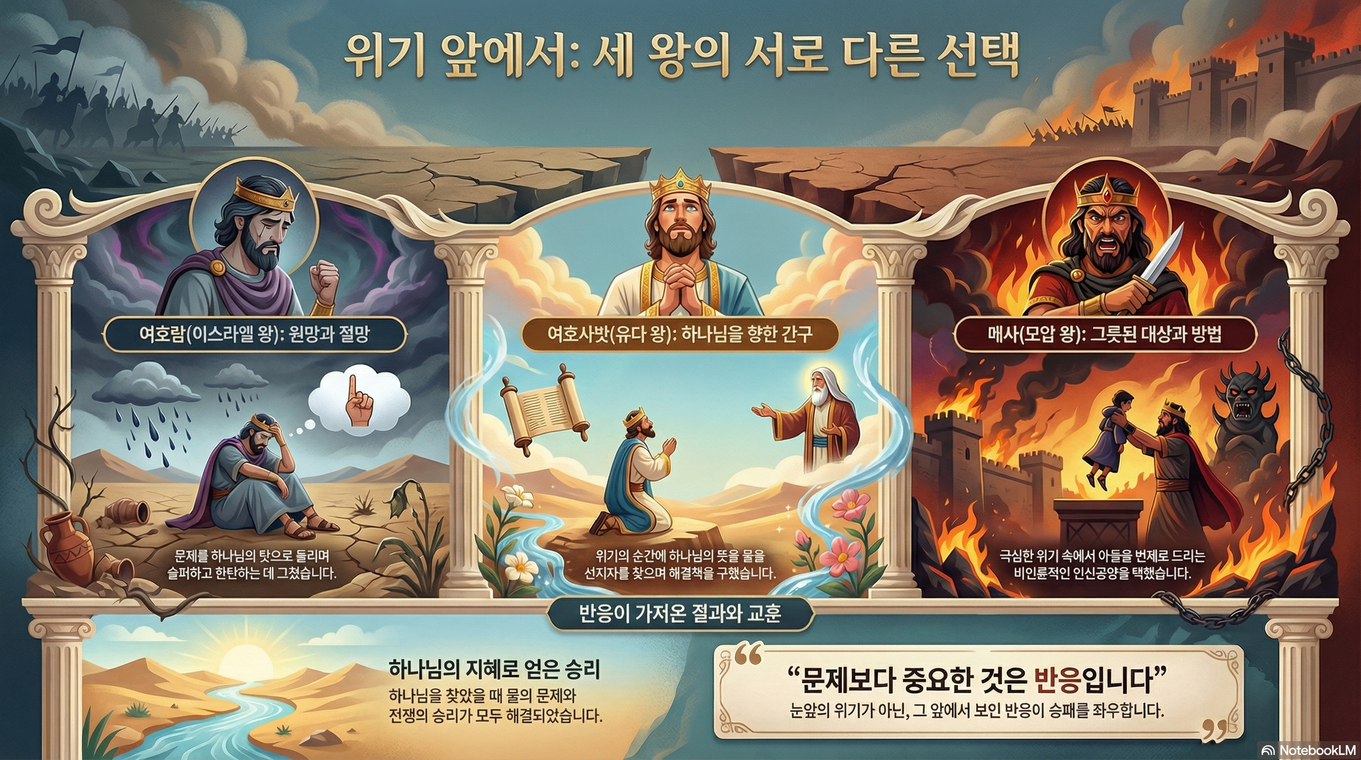 전쟁은 큰일입니다. 싸우는 것도 문제고 싸움을 준비하는 과정에서도 여러 가지 어려움들이 생기게 됩니다. 오늘 본문은 이런 문제와 어려움 앞에서 다르게 반응하는 3명의 왕이 나오고 있습니다. 이스라엘의 왕 여호람과 유다 왕 여호사밧, 모압 왕 메사입니다. 아합 왕이 죽은 다음 모압 왕 메사는 이스라엘을 배신하여 더 이상 조공을 바치지 않습니다. 이 일로 이스라엘 왕 여호람은 유다왕 여호사밧과 에돔 왕과 동맹하여 모압을 칩니다. 이렇게 모압을 치러 가는 도중에 물이 없어 어려움을 겪게 됩니다. 군사와 가축을 먹일 물이 없는 것은 아주 심각한 일입니다. 전쟁을 시작도 하기 전에 위기가 닥쳤습니다. 이 때 이스라엘 왕 여호람은 어떻게 반응하나요? “10 이스라엘 왕이 이르되 슬프다 여호와께서 이 세 왕을 불러 모아 모압의 손에 넘기려 하시는도다 하니” 한탄만 하고 있습니다. 하나님이 세 왕을 불러 모압의 손에 넘기려한다고 원망하고 있습니다. 문제 앞에서 많은 사람들이 보이는 반응입니다. 똑같은 상황에서 유다왕 여호사밧은 어떻게 반응하나요? “11 여호사밧이 이르되 우리가 여호와께 물을 만한 여호와의 선지자가 여기 없느냐 하는지라 이스라엘 왕의 신하들 중의 한 사람이 대답하여 이르되 전에 엘리야의 손에 물을 붓던 사밧의 아들 엘리사가 여기 있나이다 하니” 어려운 문제 앞에서 하나님의 선지자를 찾고 있습니다. 이 문제를 하나님께 묻고자 하고 있습니다. 한탄만 하는 여호람과 하나님께 해답을 찾으려는 여호사밧이 대조되고 있습니다. 왕의 방문을 받은 엘리사는 하나님의 말씀을 예언합니다. 하나님은 골짜기에 물이 가득할 것이라고 하십니다. 엘리사는 물의 문제뿐만 아니라 전쟁에 대해서도 예언합니다. 하나님은 모압과의 전쟁에서도 승리할 것이라고 하십니다. 물이 없는 것은 심각한 문제입니다. 전쟁의 승패를 좌우할 수도 있는 문제입니다. 이 문제 앞에서 하나님의 지혜를 구했을 때 물 문제도 해결이 되었고, 전쟁에서도 승리할 수 있었습니다. 문제가 있는 것이 문제가 아니라 문제 앞에서 어떻게 반응하느냐가 문제입니다. 눈 앞에 닥친 문제로 전쟁의 승패가 좌우되지 않습니다. 그 문제 앞에서 어떻게 반응하느냐에 좌우됩니다. 전쟁은 하나님의 말씀대로 모압이 패하고 연합군이 승리하게 됩니다. 그러자 모압 왕은 어떻게 행동하나요? “27상 이에 자기 왕위를 이어 왕이 될 맏아들을 데려와 성 위에서 번제를 드린지라” 왕위를 이을 자신의 맏아들을 성 위에서 번제로 드립니다. 인신공양을 한 것입니다. 전쟁에 지는 것은 치명적인 일입니다. 이 큰 문제 앞에서 모압 왕은 끔직한 일을 저지릅니다. 잘못된 대상에게 잘못된 방법으로 제사를 드리고 있습니다. 우리도 살다가 보면 여러 문제와 어려움을 겪게 됩니다. 우리는 어떻게 대응하나요? 모압 왕과 같이 잘못된 대상을 찾아 해결하려고 하나요? 이스라엘 왕과 같이 불평하고 원망하고 하고 있지는 않나요? 유대 왕과 같이 문제의 해결을 위해 하나님을 찾고 있나요?
