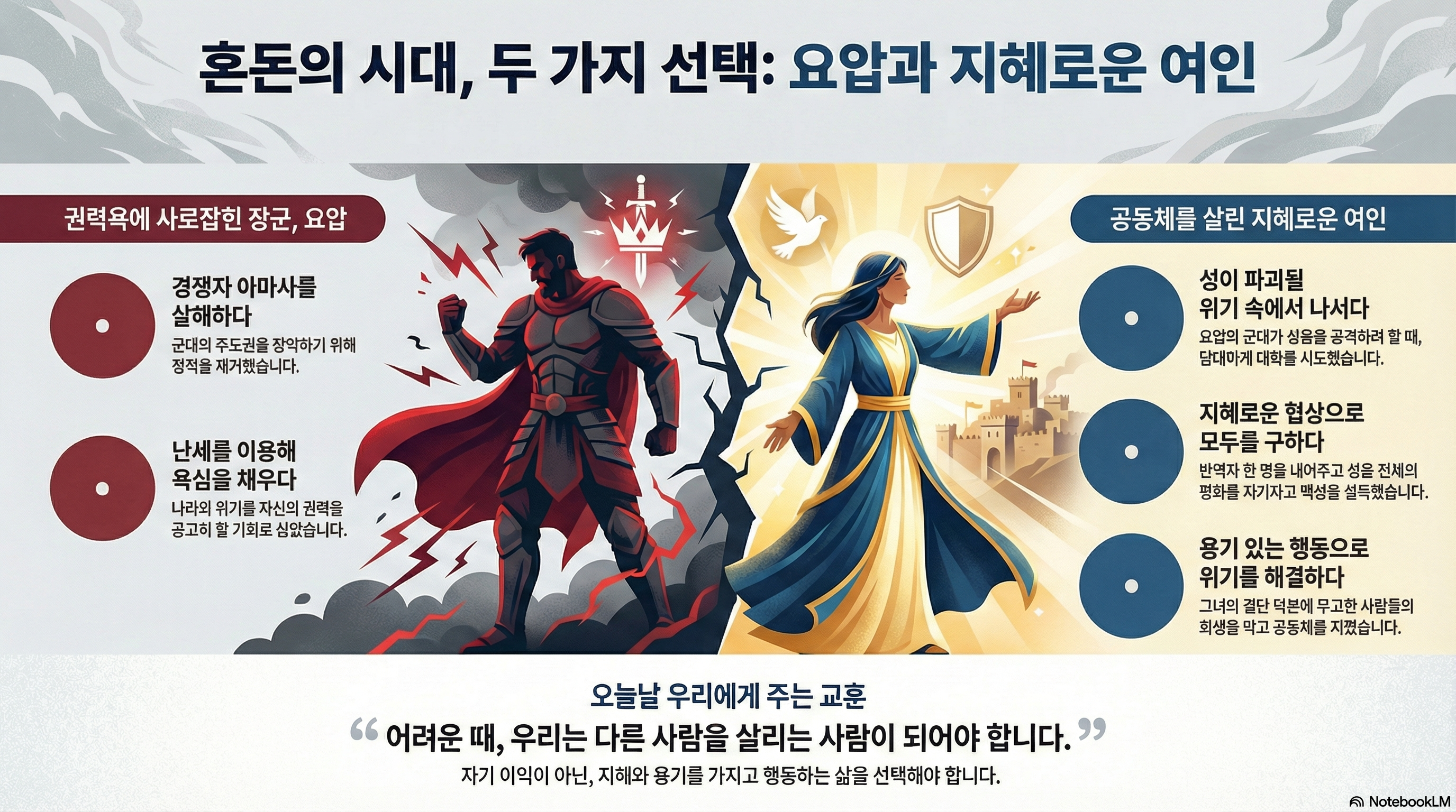 인간군상이라는 말이 있습니다. 군상이라는 말의 사전적 의미는 떼를 이룬 많은 사람을 의미합니다. 보통 인간군상이라는 말은 특별한 상황에서 다양하게 나타나는 사람들의 유형을 이야기할 때 많이 씁니다. 특히 전쟁과 같은 난세에는 여러 인간 군상들을 볼 수 있습니다. 지금 이스라엘도 난세입니다. 아들이 아버지에게 반역을 일으켰습니다. 압살롬의 반역입니다. 이 반역으로 아버지 다윗은 예루살렘에서 도망쳐야 했습니다. 결국 압살롬은 죽고 반란은 일단 진압되었습니다. 하지만 이것으로 끝이 아닙니다. 1절에 보면 또 다른 반란이 이어지고 있습니다. 베냐민 사람 비그리의 아들 세바의 반역입니다. 세바의 반역으로 이스라엘은 또 갈라집니다. 유다 사람들은 다윗을 쫓았지만 이스라엘 사람들은 반역자 세바를 따릅니다. 유다와 이스라엘의 분열은 처음이 아닙니다. 압살롬의 반역이 진압되는 과정에서도 계속 나타났습니다. 이제 아예 이스라엘이 다윗을 배신하고 세바의 편에 섭니다. 이런 난세에 다윗의 장군인 요압의 행동을 살펴보겠습니다. 9절과 10절에 보면 요압은 다른 장군인 아마사를 칼로 찔러 죽입니다. 요압이 아마사를 죽인 것은 자기 나름대로의 명분이 있었습니다. 아마사는 압살롬의 반란 때 압살롬의 편에 섰습니다. 다윗은 그런 아마사를 용서합니다. 그리고 아마사를 세바의 반란을 진압하는 장군으로 세웁니다. 요압은 이런 아마사를 죽입니다. 겉으로 내세운 명분은 있습니다. 한 번 반역한 사람이 또 반역할 것을 염려해 죽였다는 것입니다. 하지만 요압의 행동은 결국 자기가 군대의 주도권을 잡기 위한 것이었습니다. 아마사마저 없는 상황에서 요압 외에는 이스라엘 군대의 지휘관이 될 만한 사람이 없었습니다. 요압은 난세를 이용해 자신의 권력욕을 채웠습니다. 이렇게 난세에는 자기 욕심을 채우려는 다양한 인간 군상들이 나타납니다. 그런데 이런 상황에서 용기 있고 지혜롭게 행동한 한 여인이 있습니다. 세바는 반란군을 이끌고 아벨의 한 성읍으로 갑니다. 요압은 그 성읍을 에워싸고 성을 무너뜨리려고 합니다. 이때 성에 있던 한 지혜로운 여인이 나섭니다. 19절에서 요압은 성을 무너뜨리는 것이 목적이 아니라고 분명히 합니다. 목적은 반란을 일으킨 세바입니다. 그러자 여인은 성읍의 사람들을 설득합니다. 22 이에 여인이 그의 지혜를 가지고 모든 백성에게 나아가매 그들이 비그리의 아들 세바의 머리를 베어 요압에게 던진지라 이에 요압이 나팔을 불매 무리가 흩어져 성읍에서 물러나 각기 장막으로 돌아가고 요압은 예루살렘으로 돌아와 왕에게 나아가니라 성읍에 있던 한 여인이 지혜를 가지고 백성들을 설득 합니다. 반역자를 내주고 성을 지키자는 것입니다. 이 말에 성읍 사람들은 힘을 합쳐 세바의 머리를 베어 요압에게 줍니다. 요압은 약속대로 성읍에서 물러나 예루살렘으로 돌아갑니다. 성이 파괴될 위기였습니다. 이 때 한 여인의 용감하고 지혜로운 행동이 성읍의 파괴를 막았습니다. 그 성읍의 사람들을 살렸습니다. 오늘날도 난세라고 합니다. 여러 가지로 복잡하고 어려운 시대입니다. 이런 시대 어떻게 살아야 하나요? 자기 이익, 자기 권력만을 위해 사는 사람들이 있습니다. 우리는 달라야 합니다. 이러한 때 한 여인과 같이 다른 사람을 살리는 사람들이 되어야 합니다. 용기를 가지고 지혜롭게 행동할 수 있어야 합니다. 어려운 난세 하나님이 우리에게 지혜와 용기를 달라고 함께 기도하며 나아가겠습니다.