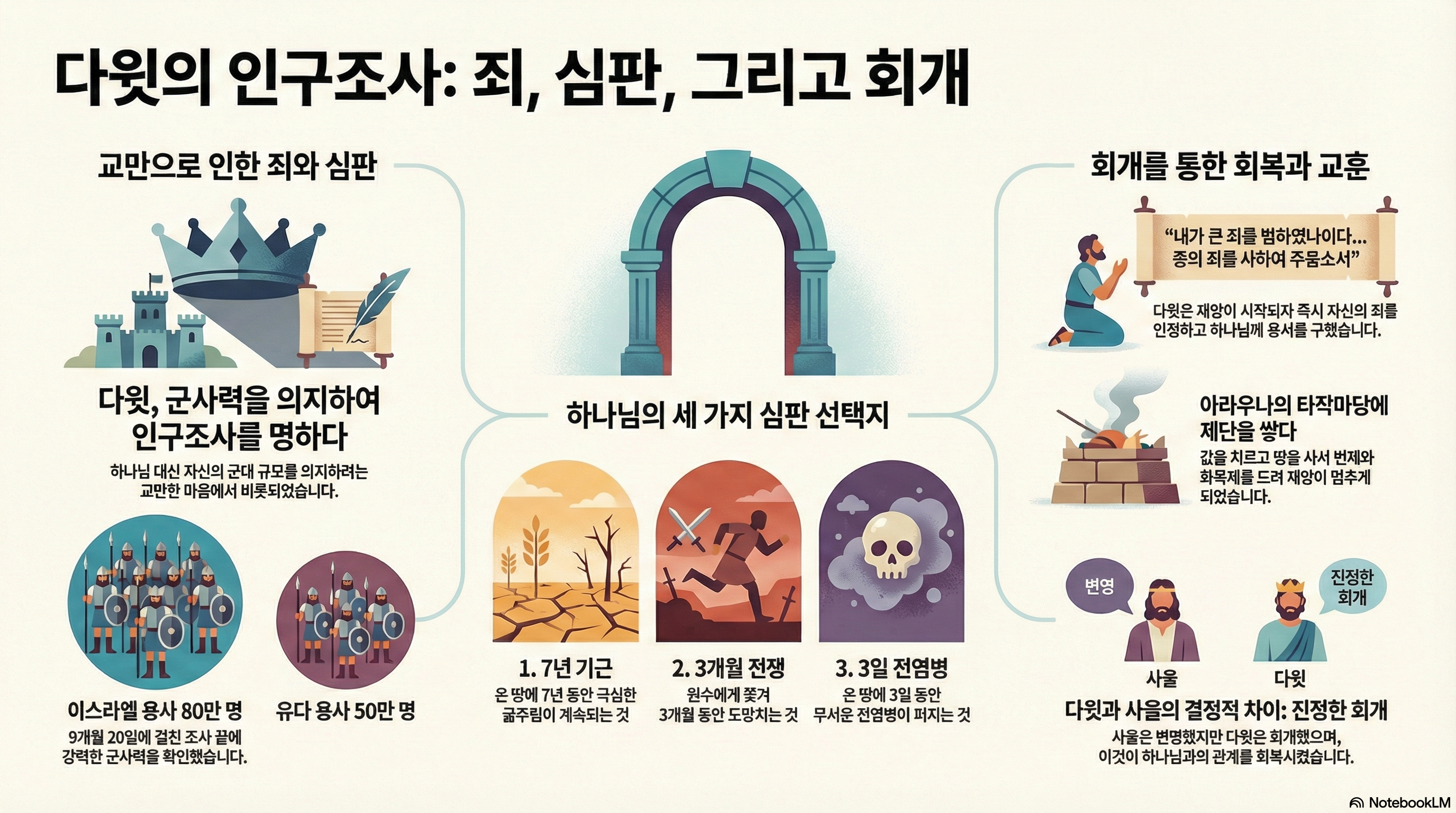 사무엘상하는 세 사람을 중심으로 이야기가 진행됩니다. 사무엘과 사울과 다윗입니다. 이 세 사람 중 가장 중요한 사람은 다윗입니다. 다윗은 하나님과 언약을 맺습니다. 다윗의 왕권이 영원할 것이라는 언약입니다. 이 언약은 궁극적으로 예수님을 통해 성취됩니다. 다윗은 예수님의 족보에서 가장 먼저 나오는 사람이 됩니다. 오늘 본문인 사무엘하24장을 통해 다윗에 대한 중요한 이야기는 마무리가 됩니다. 열왕기상 초반에 다윗의 말년의 이야기가 잠깐 나오고 본격적으로 이스라엘의 왕들에 대한 이야기가 펼쳐집니다. 다윗에 대한 이야기의 마무리를 보면서 좀 생각해봐야 하는 것이 있습니다. 사무엘상하의 내용은 대부분은 시간순서에 따라 연대기적으로 구성이 되어있습니다. 그런데 사무엘하 21장부터 24장까지는 연대기적으로 기록된 것이 아닙니다. 부록처럼 붙어 있는 내용입니다. 그 중 마지막 장인 24장은 다윗의 잘못을 보여주고 있습니다. 이것은 어떤 의미가 있을까요? 오늘 본문에서 다윗은 인구조사를 합니다. 나라를 운영할 때 인구조사가 필요하기도 합니다. 나라의 인구를 정확히 알아야 합니다. 그래야 여러 가지 정책들을 정밀하게 세울 수 있습니다. 다윗의 인구조사의 문제는 잘못된 목적 때문이었습니다. 9 요압이 백성의 수를 왕께 보고하니 곧 이스라엘에서 칼을 빼는 담대한 자가 팔십만 명이요 유다 사람이 오십만 명이었더라 다윗의 인구조사는 정밀한 정책을 세우기 위한 것이 아니었습니다. 군대의 수를 세는 것이 목적이었습니다. 국방력을 점검하기 위해 군사의 수를 세는 것 역시 그것 자체가 잘못은 아닙니다. 문제는 다윗이 군사의 수를 통해 자신의 힘을 과시하려고 했던 것에 있습니다. 우리가 여러 번 살펴보았습니다. 다윗은 수많은 전쟁에서 승리했습니다. 다윗의 승리는 군사의 수에 있지 않았습니다. 하나님이 싸우셨습니다. 하나님이 이기게 하셨습니다. 그런데 막상 전쟁에서 승리하고 평안해지자 자신의 힘을 과시하기 시작합니다. 하나님 보다 자기 눈에 보이는 군사의 수를 더 의지하기 시작합니다. 사무엘하의 마지막 장은 믿음의 사람이었던 다윗의 잘못을 보여주고 있습니다. 우리는 이것을 통해 다시 한 번 인간의 연약함을 보게 됩니다. 다윗과 같은 위대한 신앙의 위인도 조금만 방심하면 언제든지 잘못된 길로 갈 수 있습니다. 항상 근신하여 깨어있어야 합니다. 또 다윗의 성공이 다윗 개인의 능력이 아니었다는 것도 다시 한 번 확인하게 됩니다. 하나님의 열심이 있었습니다. 연약한 다윗을 하나님의 사람으로 만들어가는 하나님의 열심이 있었습니다. 이런 잘못에도 다윗은 왜 신앙의 위인으로 남을 수 있었나요? 다윗은 잘못한 것으로 끝나지 않습니다. 10 다윗이 백성을 조사한 후에 그의 마음에 자책하고 다윗이 여호와께 아뢰되 내가 이 일을 행함으로 큰 죄를 범하였나이다 여호와여 이제 간구하옵나니 종의 죄를 사하여 주옵소서 내가 심히 미련하게 행하였나이다 하니라 자신의 잘못을 깨닫습니다. 하나님께 죄를 회개하고 있습니다. 사람이 완전할 수 없습니다. 연약함 때문에 잘못을 행하기도 합니다. 이 때 어떤 사람은 끝까지 잘못을 깨닫지 못하고 자기변명만 합니다. 사울 왕이 그랬습니다. 죄를 회개하지 못하고 상황을 핑계되고, 사람을 핑계됐습니다. 다윗은 그렇지 않습니다. 자신의 죄를 인정하고 하나님께 회개합니다. 이 차이가 하나님의 사람이 되느냐 마느냐를 결정지었습니다. 이 차이가 다시 하나님과 회복할 수 있도록 했습니다. 우리는 어떤가요? 잘못을 핑계되는 사람인가요? 회개하는 사람인가요?