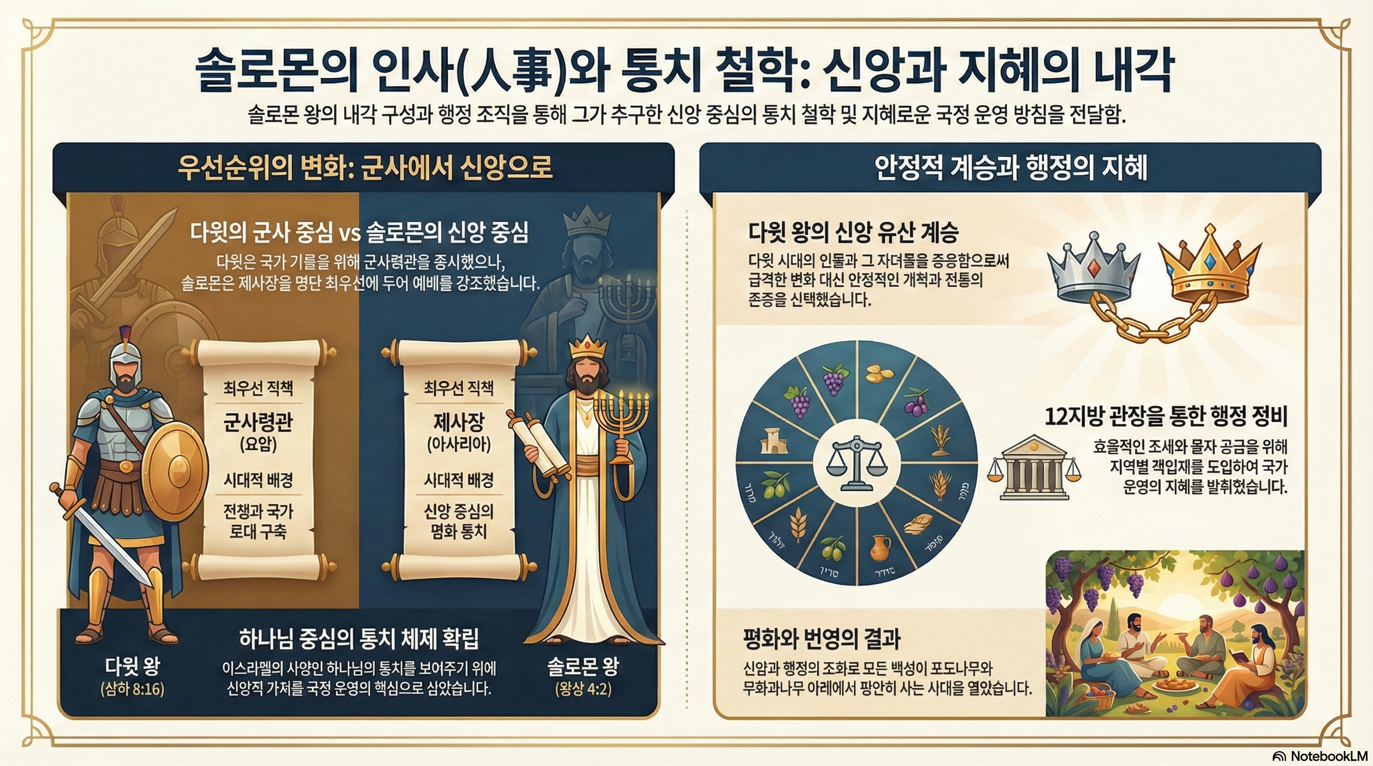 인사가 만사라는 말이 있습니다. 누구를 어디에 기용하느냐를 보면 그 사람이 어떤 정치철학을 가지고 있는지 알 수 있습니다. 오늘 본문은 솔로몬의 인사에 대한 내용입니다. 이 사람들의 명단을 보면 솔로몬이 지금 어디에 중점을 두고 왕으로서 통치하려는지 알 수 있습니다. 이 솔로몬의 내각을 이해하기 위해서 좋은 방법이 있습니다. 선대왕이었던 다윗의 내각과 비교하는 것입니다. 다윗 신하들의 명단은 사무엘하 8장 16절부터 18절에 걸쳐 나와 있습니다. 다윗의 명단은 이렇게 시작합니다. “삼하 8:16상 스루야의 아들 요압을 군사령관이 되고” 가장 먼저 군대의 최고 책임자의 이름이 나오고 있습니다. 다윗은 왕이 되기까지 참 힘들고 어려운 시간을 보내야 했습니다. 사울 왕이 죽고 나서도 여전히 왕권을 위해서 전쟁을 치뤄야 했습니다. 주변국들도 끊임없이 이스라엘을 괴롭혔습니다. 이런 상황에서 군대의 책임자는 신하들 중에서 가장 중요한 직책입니다. 솔로몬의 내각은 어떤가요? “2 그의 신하들은 이러하니라 사독의 아들 아사리아는 제사장이요” 가장 먼저 제사장이 나오고 있습니다. 새로 출범한 솔로몬이 무엇을 가장 중요시 했는가를 알 수 있습니다. 하나님에 대한 신앙을 중심에 두고 있었습니다. 이 말이 다윗은 그렇지 않았다는 말은 아닙니다. 다윗은 하나님을 의지하지 않고 군사력만 의지했다는 말은 아닙니다. 다만 이제는 시대가 바뀌었습니다. 다윗왕은 전쟁으로 토대를 쌓았습니다. 이제 솔로몬은 무엇보다 하나님께 제사하는 것, 예배 하는 것, 하나님 중심으로 정치를 해나갈 준비가 되었습니다. 이것은 이스라엘에게는 아주 중요했습니다. 이스라엘은 하나님이 선택하신 특별한 나라입니다. 이스라엘은 이 세상에서 하나님의 통치를 보여주어야 하는 사명이 있는 나라입니다. 이것에 성공했을 때 이스라엘은 하나님의 축복을 받습니다. 이 일에 실패했을 때 이스라엘은 하나님의 심판을 받게 됩니다. 두 번째로 솔로몬의 신하들의 명단을 보면 다윗 왕의 신하들과 연관된 인물들이 많습니다. 3절에 나오는 아힐룻의 아들 여호사밧은 다윗 왕 시대에도 사관이었습니다. 4절에 여호야다의 아들 브나야가 군사령관인데 다윗시대에도 중책을 맡았습니다. 다윗 때부터 제사장이었던 사독과 선지자였던 나단의 자녀들이 솔로몬의 신하들의 명단에 있습니다. 솔로몬이 신하를 세울 때 다윗의 유산을 존중했다는 것을 알 수 있습니다. 새로운 시대가 되었다고 해서 자기 마음대로 사람을 세우지 않습니다. 하나님의 사람이었던 다윗의 뜻을 잘 헤아려 필요한 사람을 세웠습니다. 개혁은 그냥 다 바꾸는 것이 아닙니다. 좋은 것은 이어받고 악한 것을 정리해야 합니다. 개혁을 한다고 그냥 다 엎어버리는 것은 오히려 많은 사람들의 반발을 살 수 있습니다. 세 번째로 7절부터 보면 솔로몬이 지방행정조직을 정비하는 것을 볼 수 있습니다. 세금을 걷는 일도 지역별로 배분해서 조절하는 것을 볼 수 있습니다. 나라를 신앙으로 다스리는 것은 막연한 종교행위가 아닙니다. 하나님이 주시는 지혜를 가지고 나라를 다스려야 합니다. 나라를 통치하기 위해서는 여러 가지 지혜가 필요합니다. 사람들 간의 갈등도 잘 조절해야 합니다. 이런 능력이 있는 사람이 나라를 잘 다스릴 수 있습니다. 솔로몬은 신앙 중심의 내각을 꾸렸습니다. 아버지 다윗의 신앙적 유산을 잘 이어받았습니다. 행정적으로도 잘 정비했습니다. 그 결과 나라는 번성하고 평화로웠습니다. “25 솔로몬이 사는 동안에 유다와 이스라엘이 단에서부터 브엘세바에 이르기까지 각기 포도나무 아래와 무화과나무 아래에서 평안히 살았더라” 나라가 어렵다는 이야기들을 많이 합니다. 나라와 나라를 다스리는 지도자들을 위해 기도해야 합니다. 이 나라가 하나님의 뜻이 세워지는 나라가 될 수 있도록 기도해야 합니다. 적폐는 청산되고 좋은 문화는 계승되는 나라가 되도록 기도해야 합니다. 이 땅의 지도자들이 지혜롭게 다스릴 수 있도록 기도해야 합니다.