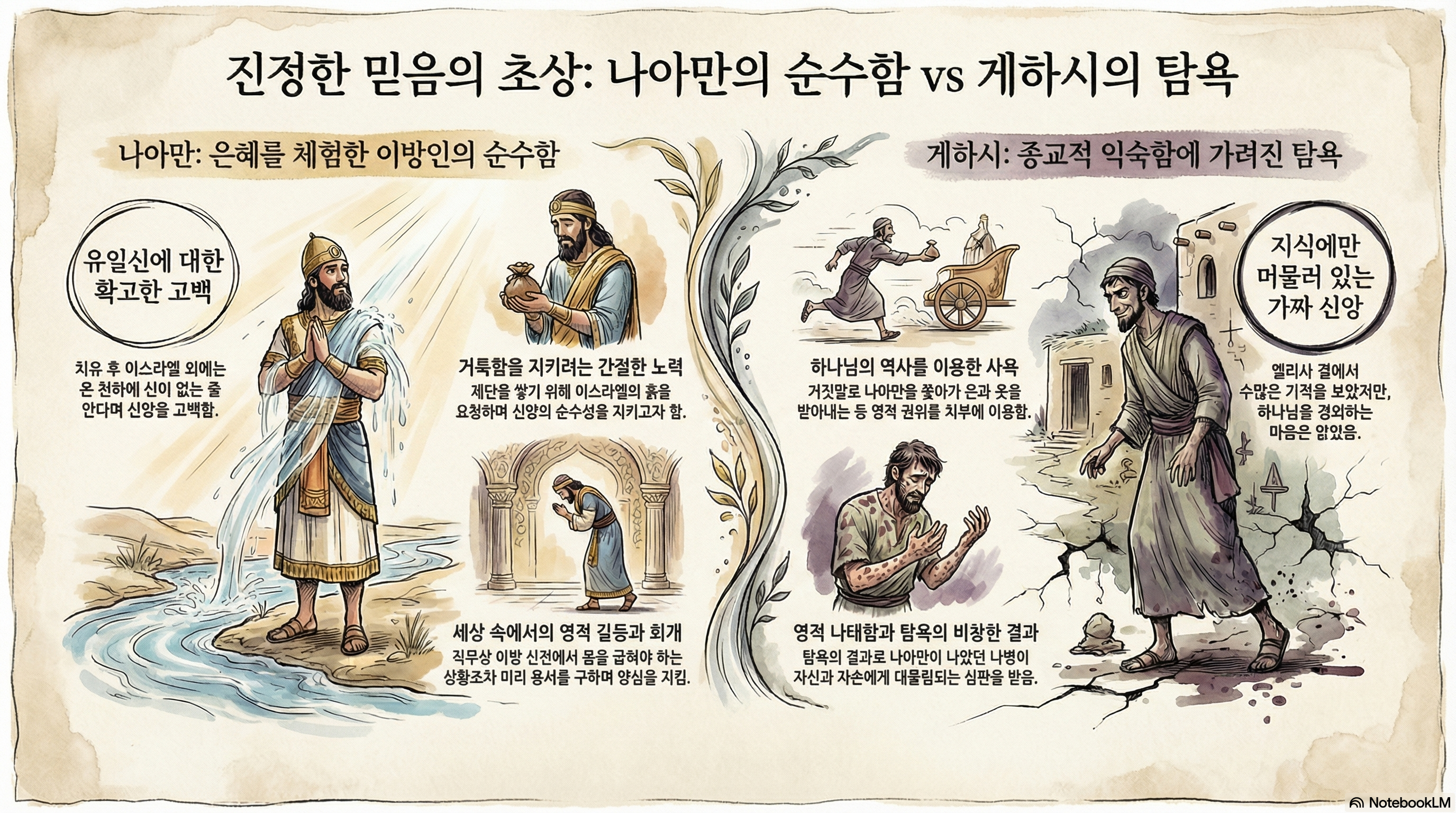 열왕기하 5장에는 참 다른 두 사람이 나옵니다. 아람의 장군 나하만과 엘리사의 사환 게하시입니다. 이 두 사람의 모습을 통해 하나님을 믿는 것이 어떤 것인지 한 번 살펴보겠습니다. 나아만의 이야기는 익숙합니다. 아람의 장군이었던 나아만은 나병이 걸렸습니다. 이 때 여종의 소개로 엘리사를 만납니다. 엘리사는 나아만에게 요단강에 가서 몸을 일곱 번 씻으라고 합니다. 나아만이 이 말에 순종했을 때 나병이 나았습니다. 이 때 나아만의 반응이 15절에 나옵니다. 나아만은 오직 하나님만이 유일하신 신이라는 것을 알고 고백합니다. 이방인이었던 나아만은 이제 하나님을 알게 되었습니다. 이 때 나아만은 한 가지 부탁을 합니다. 17절에 보면 이스라엘의 흙을 가져가게 허락해달라는 부탁입니다. 흙을 달라는 요구 뒤에 제사의 이야기가 나오고 있습니다. 이제 고향으로 돌아가면 하나님 외에 다른 신에게는 제사를 드리지 않겠다고 이야기 합니다. 그렇다면 이 흙은 하나님께 제사드릴 제단을 쌓을 흙입니다. 물론 아람의 흙으로 제단을 쌓아도 문제가 되지 않습니다. 이방의 땅의 흙으로 제사를 드렸다고 하나님이 제사를 거부하지 않으십니다. 디만 이것을 통해 나아만의 순수한 마음을 볼 수 있습니다. 나아만은 이제 막 하나님을 알게 되었습니다. 그래서 제단을 쌓을 흙마저 이스라엘 땅에서 가져가고 싶어 합니다. 조금이라도 더 자신의 신앙을 순수하게 지켜내려는 모습을 볼 수 있습니다. 이런 나아만의 모습을 한 가지 더 보겠습니다. “18 오직 한 가지 일이 있사오니 여호와께서 당신의 종을 용서하시기를 원하나이다 곧 내 주인께서 림몬의 신당에 들어가 거기서 경배하며 그가 내 손을 의지하시매 내가 림몬의 신당에서 몸을 굽히오니 내가 림몬의 신당에서 몸을 굽힐 때에 여호와께서 이 일에 대하여 당신의 종을 용서하시기를 원하나이다 하니” 이제 나아만은 아람으로 돌아가야 합니다. 아람으로 돌아가면 왕을 따라서 이방신전을 방문해야 합니다. 물론 자신은 더 이상 이방신을 섬기지 않습니다. 하지만 그래도 일 때문에 이방신전에 가서 이방 신에게 겉모양이지만 몸을 굽히게 되더라도 용서해 달라고 이야기 합니다. 이제 막 하나님을 믿었습니다. 그런데 살아가야 하는 세상은 바뀐 것이 전혀 없습니다. 다만 내가 하나님의 사람으로 바뀌었을 뿐입니다. 그러니 세상에 살면서 여러 가지로 부딪치는 일이 많고 갈등이 생깁니다. 나아만은 이런 세상에서 순수하게 신앙을 지키며 살려고 노력하고 있습니다. 이런 나아만과 대조되는 사람이 나옵니다. 엘리사의 사환 게하시입니다. 나아만은 이제 막 하나님을 알고 믿었습니다. 게하시는 다릅니다. 엘리사의 사환입니다. 엘리사를 통하여 하나님의 놀라운 역사를 여러 번 경험했습니다. 그런데 어떻게 하나요? 22절에 보면 돈에 욕심이 나서 엘리사 몰래 나아만을 쫓아가 돈을 요구합니다. 돈을 받는 것까지는 성공합니다. 하지만 결국 벌을 받아 나아만이 걸렸던 나병에 걸리게 됩니다. 게하시는 하나님을 지식으로는 알았습니다. 엘리사 밑에 있었으니 하나님에 대한 이야기를 얼마나 많이 들었겠습니까? 하지만 그 마음으로 하나님을 믿는 사람은 아니었습니다. 하나님의 놀라운 역사를 이용해 부당한 돈을 챙기려 했습니다. 이런 게하시의 모습은 오늘 우리에게 경고를 줍니다. 어떤 사람은 오랫동안 교회에 다녔기에 교회 생활을 익숙할 수 있습니다. 종교행위에 익숙할 수 있습니다. 교회에 익숙한 것이 그 사람의 믿음은 아닙니다. 우리는 어떤가요? 게하시와 같이 그냥 교회 생활, 종교생활에 익숙한 사람들은 아닌가요? 나아만과 같이 예수님을 처음 믿었을 때의 그 순수한 마음을 간직하고 있나요?