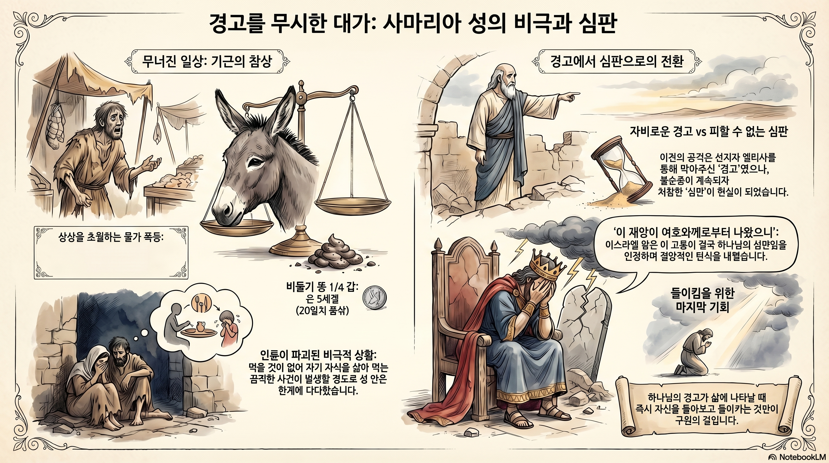 이스라엘 땅에 끔찍한 일이 벌어지고 있습니다. 물가는 말도 안되게 올랐습니다. 25절에 보면 나귀 머리 하나에 은 팔십 세겔, 비둘기 똥 사분의 일 갑에 은 다섯 세겔이라고 나옵니다. 이스라엘 백성들에게 나귀는 부정한 동물이었습니다. 그래서 식용으로 사용하지 않았습니다. 머리는 더욱 값이 싼 부위였습니다. 이 부정한 나귀 머리 하나가 80세겔입니다. 은 1세겔은 당시 노동자의 4일 품삯이었습니다. 80세겔은 320일 품삯입니다. 비둘기 똥도 다섯 세겔입니다. 이 비둘기 똥이 식용으로 사용되었는지 연료로 사용되었는지 정확히 알 수 없습니다. 비둘기 똥 한 뭉큼이 20일 품삯입니다. 더 문제는 아무리 돈을 많이 주어도 먹을 것을 구할 수가 없습니다. 그래서 성 안에서는 끔찍한 일도 벌어졌습니다. 28절과 29절에 보면 한 여인이 이스라엘의 왕에게 한탄합니다. 그런데 그 내용이 끔찍합니다. 먹을 것이 없어 다른 여인과 아들을 삶아 먹었습니다. 그런데 다음날 다른 여인이 자신의 아들은 숨겼습니다. 그래서 억울하다고 왕에게 호소하러 왔습니다. 정말 상상도 못할만한 일이 벌어졌습니다. 왜 이스라엘 땅에 이런 일이 벌어졌습니까? 24절에 보면 그 이유가 나오고 있습니다. 아람 왕 벤하닷이 군대를 모아 사마리아 성을 포위했습니다. 성중에 있던 양식이 떨어져 이런 일이 벌어졌습니다. 그런데 이 포위사건을 좀 생각해 볼 필요가 있습니다. 8절부터 보면 역시 아람의 공격에 대한 기사가 있습니다. 아람 왕이 이스라엘 공격하기 위해 군사를 보냅니다. 그 때 엘리사가 이스라엘 왕에서 아람이 어느 쪽으로 올지를 미리 가르쳐줍니다. 적이 올 것을 미리 알고 준비하고 있으면 방어하기가 어렵지 않습니다. 여러 번 아람의 공격을 막았습니다. 그런데 오늘 본문은 완전히 달라졌습니다. 아람의 군대가 사마리아 성을 포위했습니다. 차이가 뭐지요? 여인의 한탄을 들은 왕은 엘리사를 잡으러 사람들을 보냅니다. “33 무리와 말을 할 때에 그 사자가 그에게 이르니라 왕이 이르되 이 재앙이 여호와께로부터 나왔으니 어찌 더 여호와를 기다리리요” 왕은 지금 아람의 공격이 하나님이 주신 것이라고 말하고 있습니다. 왜 하나님이 이방민족이 자신의 백성들을 공격하게 합니까? 하나님의 심판입니다. 이스라엘 백성들이 하나님의 말씀에 불순종했을 때 하나님은 이방민족을 심판의 도구로 사용하십니다. 그렇다면 6장 8절부터 나와 있는 아람의 공격은 일종의 하나님의 경고로 볼 수 있습니다. 하나님이 아람이 이스라엘을 공격하게 하는 것으로 경고하셨습니다. 이 공격은 경고이기에 이스라엘의 하나님의 도움으로 쉽게 아람을 물리칠 수 있었습니다. 하지만 하나님의 계속되는 경고에도 이스라엘은 돌이키지 않았습니다. 결국 하나님의 무서운 심판을 받고 있습니다. 하나님의 경고를 들어야 합니다. 하나님께서 우리 삶에 경고를 보내실 때 우리의 삶을 돌아볼 수 있어야 합니다. 하나님의 경고가 있을 때 우리가 돌이키면 하나님은 그 심판에서 구원의 길을 열어주십니다. 돌이키지 않는다면 경고는 현실이 됩니다. 교회도 마찬가지입니다. 나라도 마찬가지입니다. 하나님의 경고를 듣고 돌아설 수 있어야 합니다. 어떤가요? 하나님께서 우리의 삶에, 우리 교회에, 우리나라에 경고를 보내고 계시지는 않는가요?