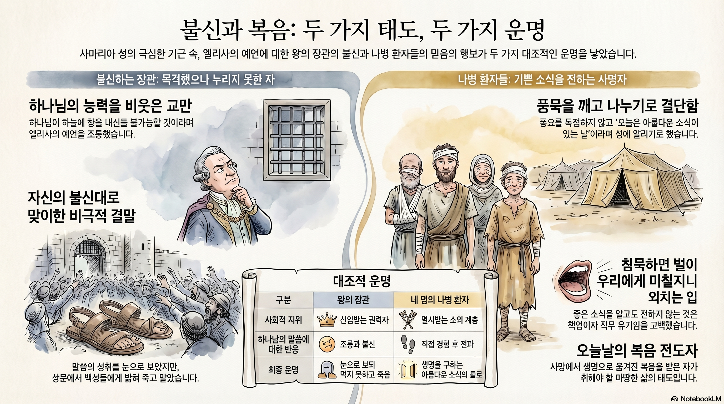 성경을 읽다보면 대조되는 두 종류의 사람이 나오는 것을 자주 보게 됩니다. 열왕기하 7장에도 두 종류의 사람이 대조되어 나타납니다. 한 사람은 왕이 신임하는 한 장관입니다. 다른 사람들은 네 명의 나병 환자들입니다. 장관과 나병환자 서로 처지가 완전히 다릅니다. 한 쪽은 사람들에게 인정받는 사람입니다. 다른 한 쪽은 사람들에게 멸시는 받는 사람들입니다. 하지만 이 둘의 운명이 완전히 바뀌게 됩니다. 아람의 포위공격이 계속되는 가운데 엘리사는 사마리아가 안정을 찾을 것이라고 예언합니다. 미친 듯이 올랐던 물가가 제자리를 찾을 것이라고 합니다. 이 말을 들은 왕의 신임을 받는 장관은 어떻게 반응하나요? 2절에 보면 장관은 부정적으로 반응합니다. 엘리사는 하나님의 말씀을 전했습니다. 하지만 장관은 하나님의 능력을 신뢰하지 않습니다. 하나님이 하늘에 창을 내도 불가능할 것이라고 조롱합니다. 엘리사는 하나님의 능력을 믿지 못하는 장관에게 눈으로 보지만 먹지 못할 것이라고 합니다. 결국 장관은 어떻게 되나요? 장관도 모든 문제가 해결되고 하나님의 말씀이 성취되는 것을 보았습니다. 하지만 17절에 보면 백성들에게 밟혀 죽고 말았습니다 엘리사의 말이 그대로 이루어졌습니다. 이 장관은 하나님의 능력을 믿지 않았습니다. 하나님의 말씀대로 될 리가 없다고 말했습니다. 다른 사람은 복을 누렸지만 자신은 자신이 말한 대로 되었습니다. 잘못된 자신의 믿음대로 죽고 말았습니다. 오늘 본문에는 대조되는 사람들이 나옵니다. 네 명의 나병환자입니다. 이 사람들은 아람의 진영으로 찾아갑니다. 성에 있으면 굶어죽을 수밖에 없습니다. 그럴 바에 차라리 아람 군대에 항복해서 처분을 기다리자는 심정으로 갔습니다. 아람 진영에 도착한 그들은 놀라운 광경을 보게 됩니다. 사마리아 성을 포위했던 아람의 군사들은 한 사람도 없었습니다. 하나님께서 이들을 다 물러나게 하셨기 때문입니다. 처음 네 명의 나병환자들은 정신이 없었습니다. 먹고 마시고 병사들이 남기고 간 금은과 의복을 감추기 바빴습니다. 그러다 한 가지를 깨닫게 됩니다. “9 나병환자들이 그 친구에게 서로 말하되 우리가 이렇게 해서는 아니되겠도다 오늘은 아름다운 소식이 있는 날이거늘 우리가 침묵하고 있도다 만일 밝은 아침까지 기다리면 벌이 우리에게 미칠지니 이제 떠나 왕궁에 가서 알리자 하고” 아람이 물러갔다는 소식을 자기들만 알고 누려서는 안된다는 것을 생각하게 됩니다. 지금도 성 안에서는 사람들이 공포에 떨며 굶어 죽어가고 있습니다. 아람의 군대가 물러갔다는 것을 알면 모든 문제는 단순에 해결이 됩니다. 나병환자들은 이 소식을 성에 알리게 됩니다. 이 때 나병환자들의 고백을 한 번 생각해볼 필요가 있습니다. “오늘은 아름다운 소식이 있는 날이거늘 우리가 침묵하고 있도다 만일 밝은 아침까지 기다리면 벌이 우리에게 미칠지니” 자신들이 알고 있는 이 좋은 소식을 알리지 않고 침묵하고 있다면 자신들에게 벌이 내릴 것이라고 합니다. 이 말씀을 복음 전도에 많이 적용합니다. 우리는 복음을 받았습니다. 사망에서 생명으로 옮기는 복음입니다. 이 복음을 알지 못하는 사람들은 여전히 사망에 있습니다. 좋은 소식, 복음을 받은 우리가 할 일은 이 소식을 모르는 사람들에게 알리는 일입니다. 네 명의 나병환자는 좋은 소식을 알리는 귀한 역할을 감당하고 있습니다. 장관은 하나님의 능력을 믿지 못했기에 자신의 믿음대로 죽었습니다. 나병환자들은 하나님의 능력을 경험하고 그것을 알리고 있습니다. 어떤 삶을 살아야 하나요? 잘못된 믿음으로 심판을 받은 장관을 따라 살지 말아야 합니다. 좋은 소식을 전하는 삶을 살아야 합니다.